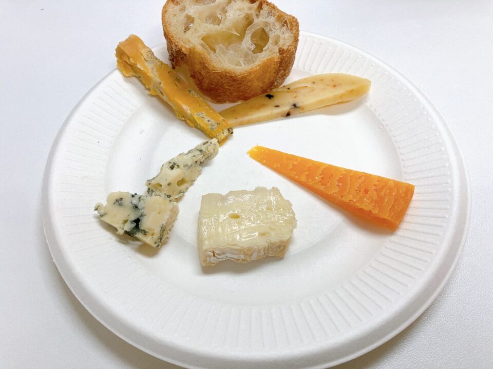 白カビ、青カビ、スロップシャーブルー、ゴーダトマト&オリーブ、ミモレットの5種類のチーズ。初めて食べるスロップシャーブルーの美味しさに感激しました。