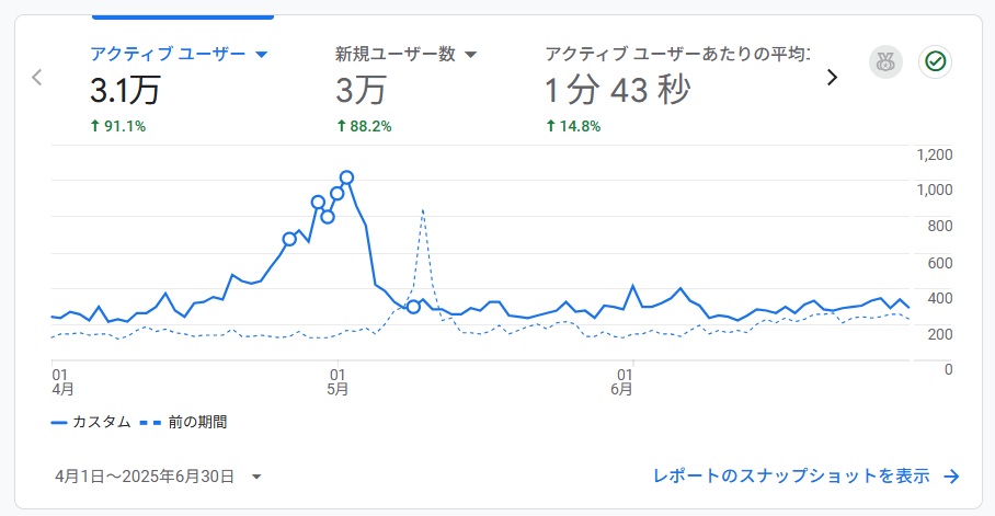この3ヶ月は新規・リライト合わせて約30記事でした。前期からユーザー数が1万増えています。うち1千人は全世界から一気にアクセスが集まる日が月1ペースであるからです。あれはなんなんでしょう?謎です。