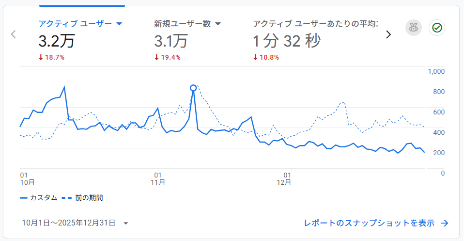 この3ヶ月は新規・リライト合わせて28記事でした。通常運転のはずが前期からユーザー数が爆上がり!1.8万人増えています。全体的に良くなっていると思いたいのですが、実際にはとある記事1つで増加分のほとんどのアクセスを集めています。ユーザーイコール新規ユーザーなんですよね。リピーターがほとんどいないということでしょうか?