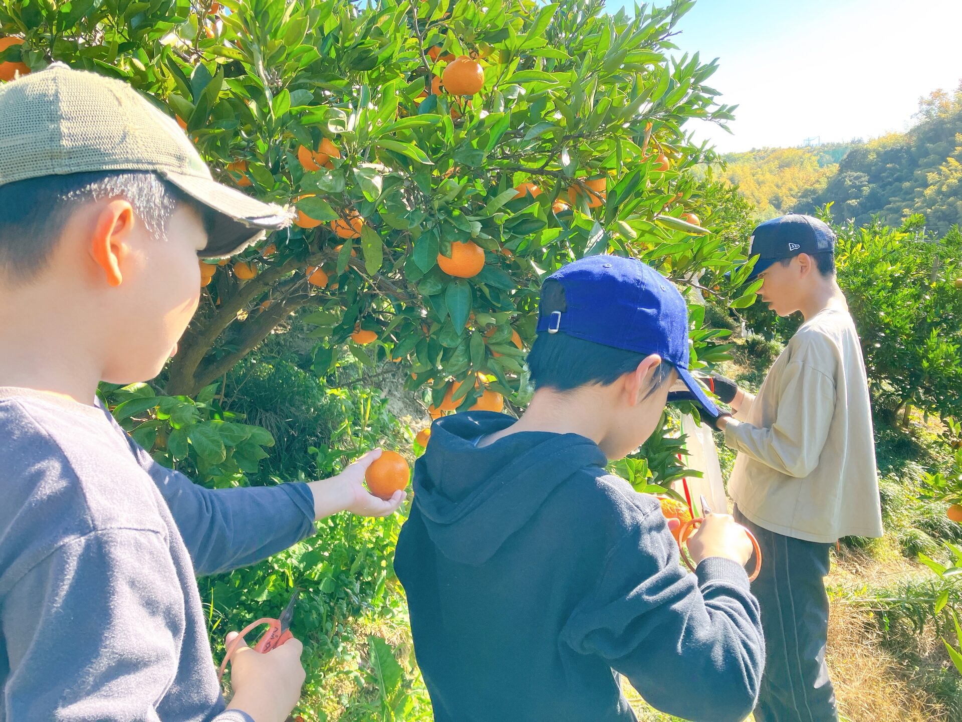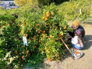 まずは、オーナー制度で購入した2本のみかんの木を、みんなで手分けしてひとつ残らず収穫します。