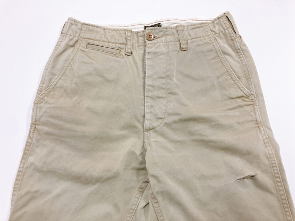 薄手の生地なので全体としてはメリハリのないのっぺりとした色落ちになってしまった感がありますが、前ポケットにできたアタリ(ヒゲ?)はいい感じ。