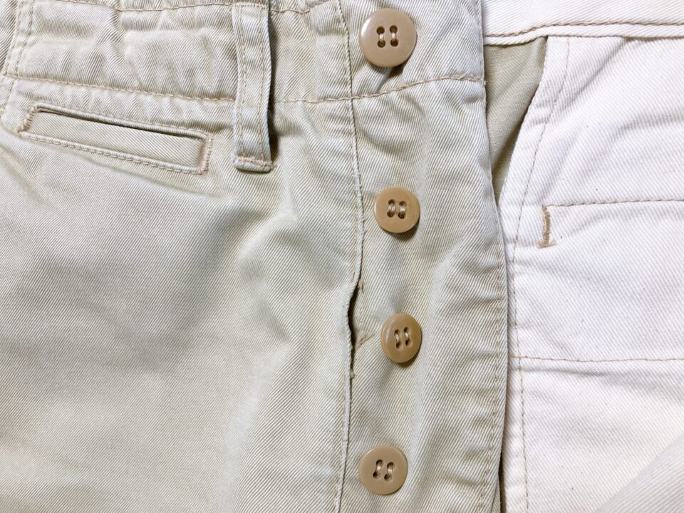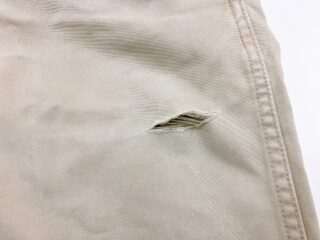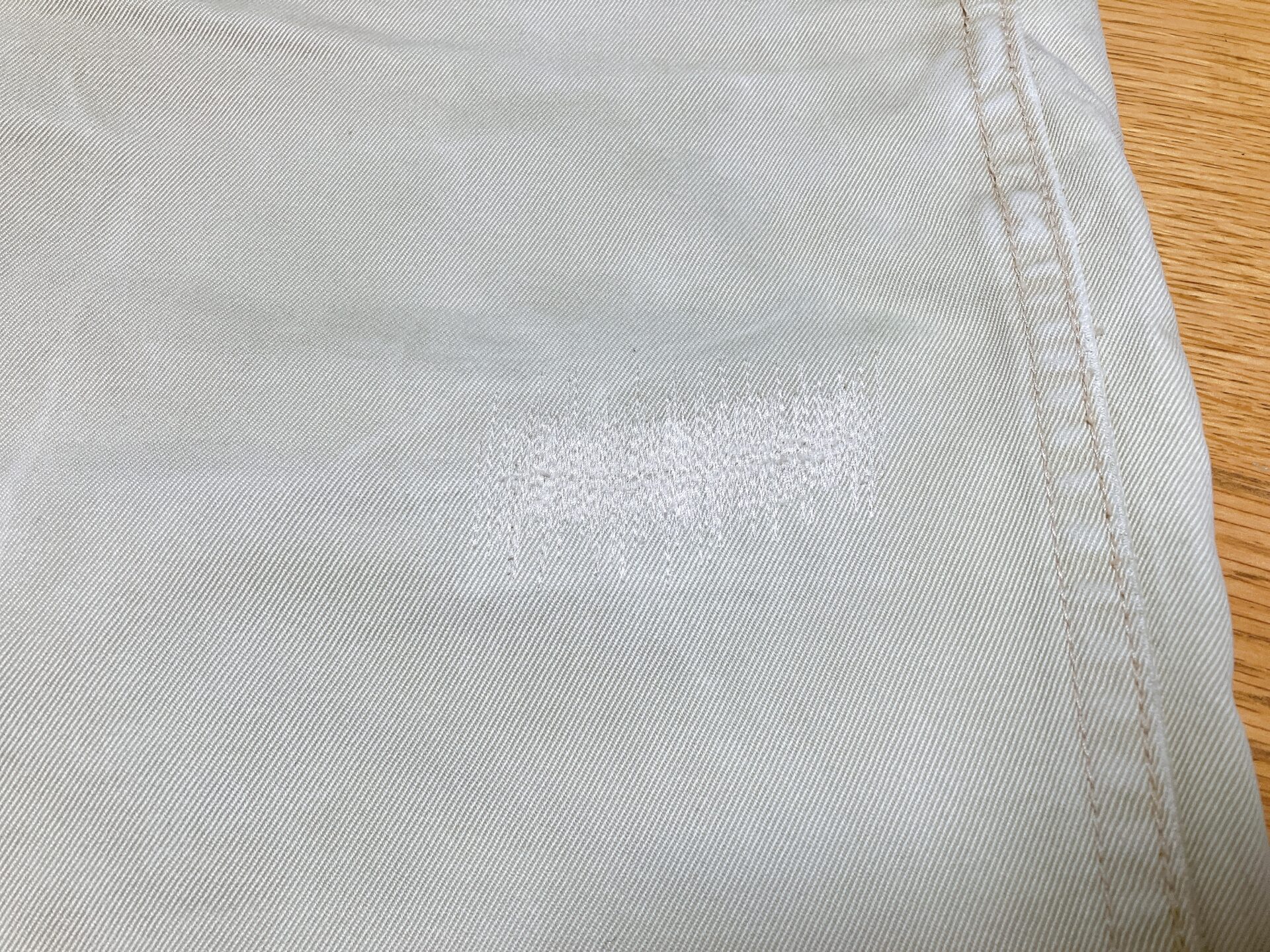 この前、膝を直したと思ったら、今度はお尻です。ジョーマッコイのワークパンツも同じでしたが、僕は左のバックポケットの辺りの生地が弱くなる傾向があるみたいですね。2本とも太めのシルエットなので、それが関係しているのかもしれません。