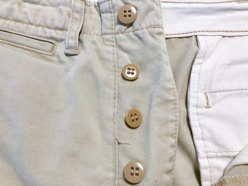 大きめのサイズゆえにヒゲはくっきりはっきりというよりはぼんやりです。それでも長年履き込んでいるのでフロントボタンのアタリも確認できます。