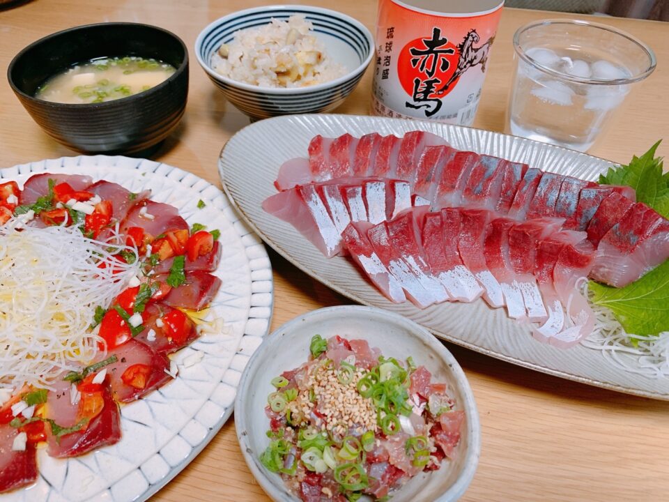 今回の大漁祭りはギリギリメジロの刺身、カルパッチョとなめろうに石垣島の個性的な味わいの泡盛 赤馬のソーダ割りをあわせてみました。