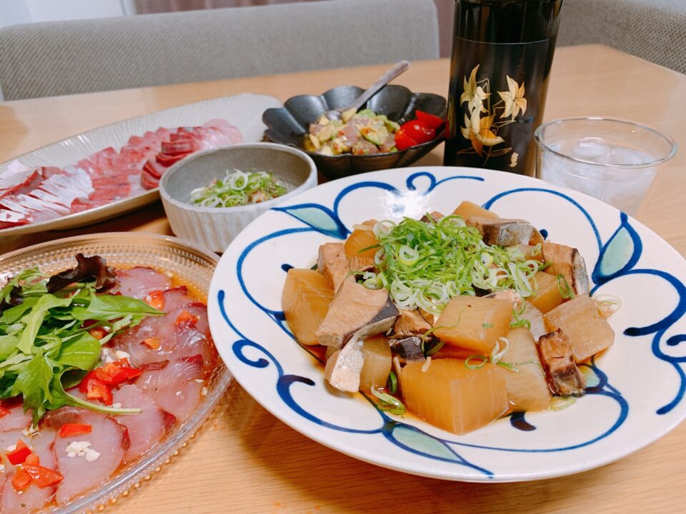 刺身、なめろう、ブリ・ポケ風、カルパッチョ、そしてブリ大根のブリ尽くし。あわせたお酒は石垣島の泡盛shirayuri inui。