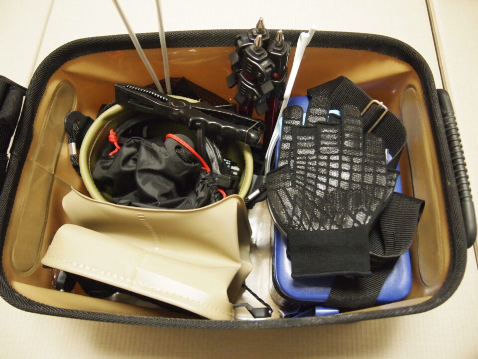 ブルーキング中に穴釣りはやらなくていいんじゃないか?とは思いますが、あたりがないと暇なので。シラサエビを入れるクーラーボックスがなかったらだいぶ荷物を減らせると思います。