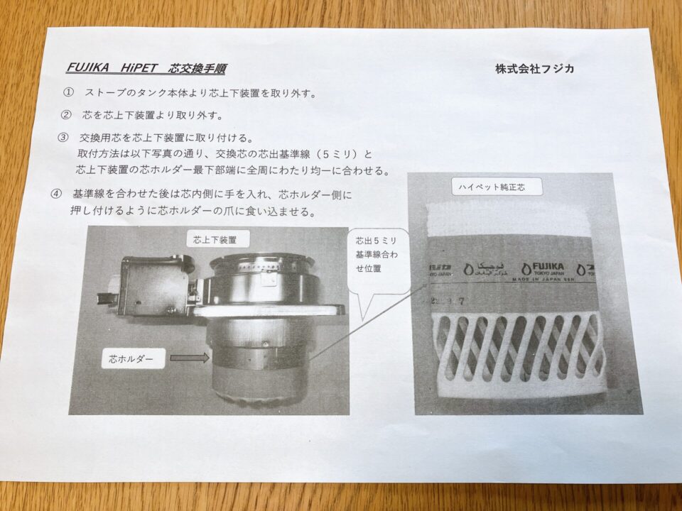 取説によると、水平空気孔を芯で塞がぬよう、芯を出した状態で均一に5~6mm出ているようにと、芯の取り付け位置の調整は難しそうに感じましたが、購入した芯に取説よりもわかりやすい説明書きが付いていました。