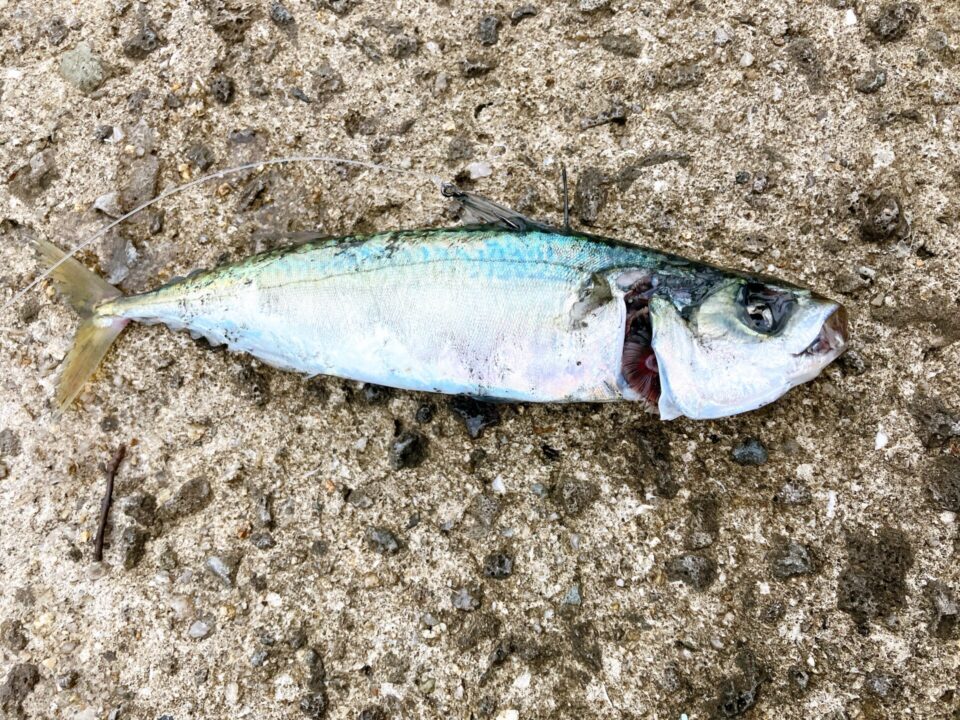 様子見に回収するとサバが傷を負っていて、隣にいた釣り名人に聞くとサゴシかもしれないということでした。大きめの中サバだったのに暴れる様子もなく、ドラグも鳴らなかったので全く気づきませんでした。