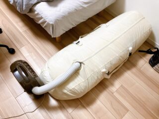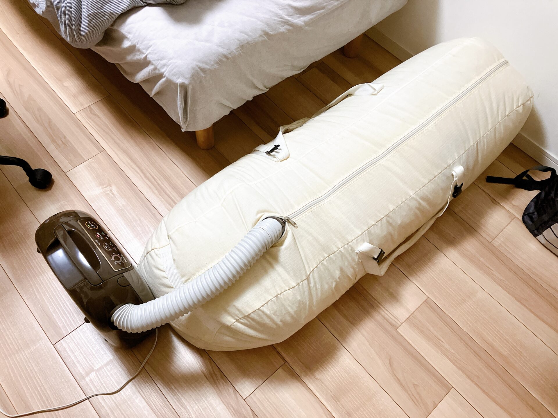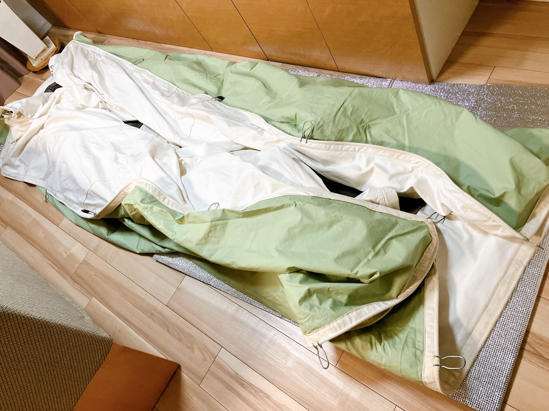 現在、マンションの大規模修繕中でベランダが使えないので、リビングに広げて、もう一つは布団乾燥機でガンガン乾かします。