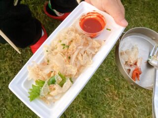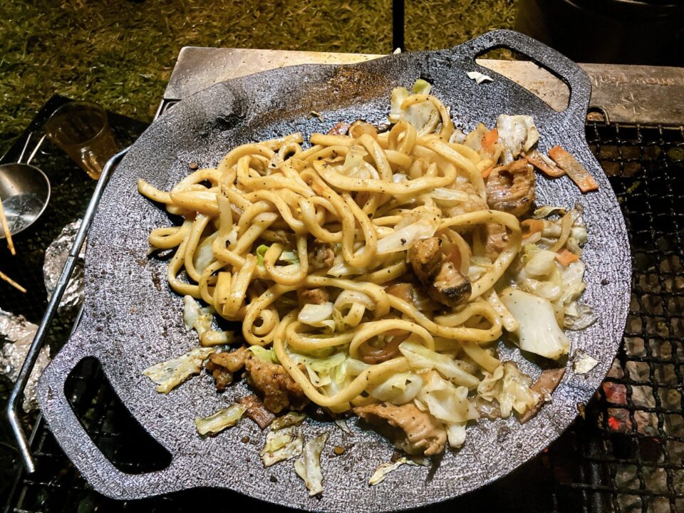 そして、こちらが完成したミノ入り焼きうどんなんですが、焼け焦げたNさんのマルチグリドルが痛々しい。