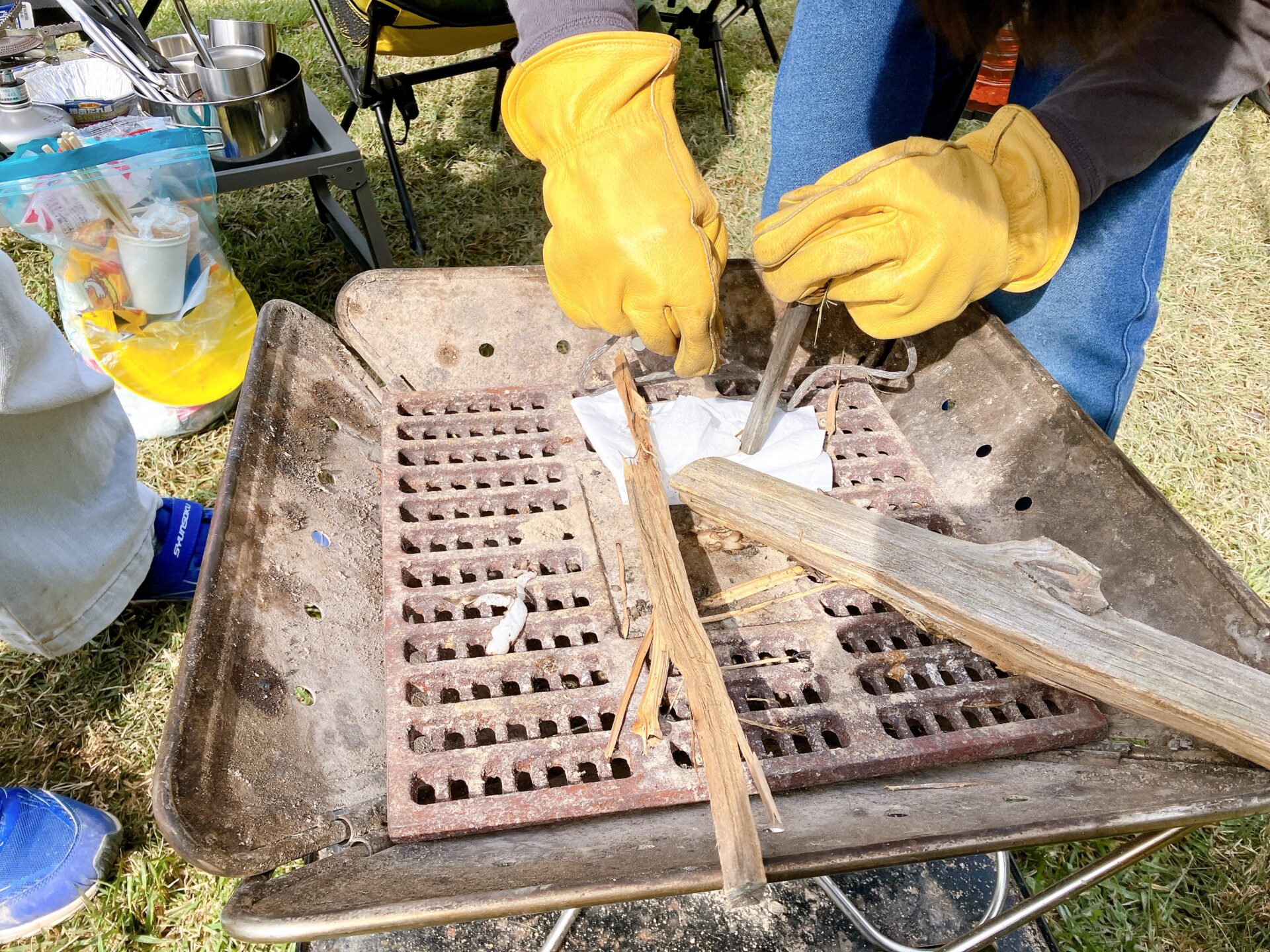 食べてばっかりみたいですが、温泉組が出掛けている間に薪割りをしたり、夕飯はまた炭で焼きたいものがあったので、野良スティックで火起こし体験のようないわゆるキャンプみたいなこともしました。