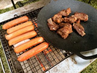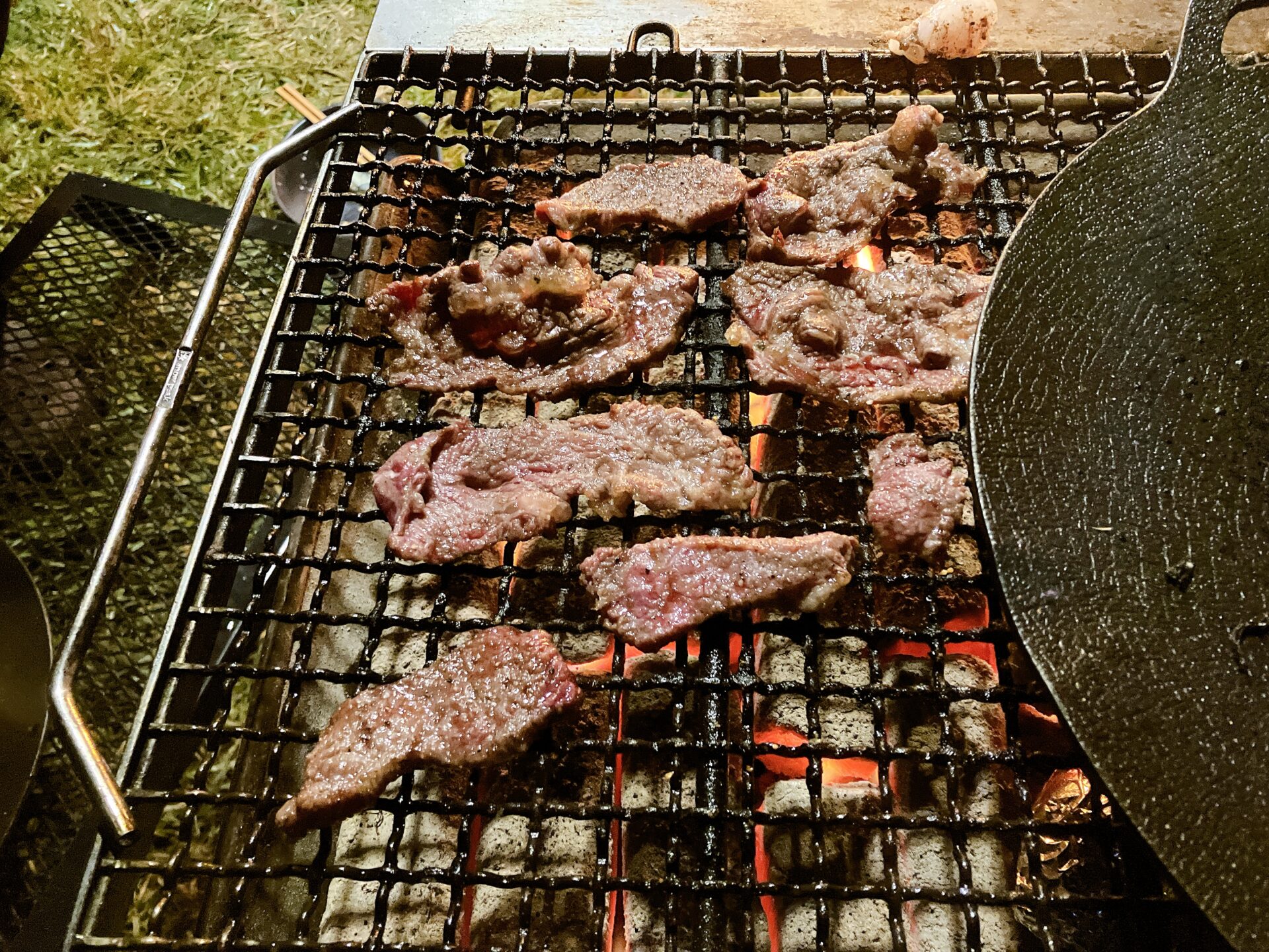 炭がいこったタイミングで降り出した雨のせいで、炭火で焼くのは叶わなかったけど、宴会幕に避難してグリドルでじっくり焼きます。
