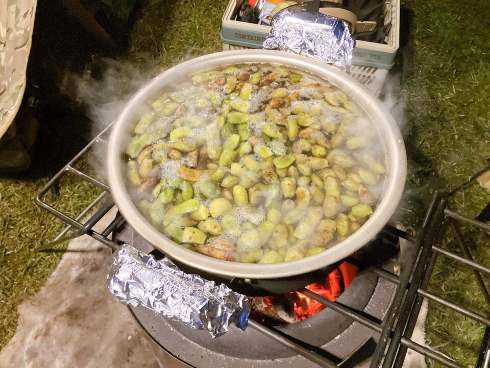 よく見ると鍋の取手が熱で溶けないようにアルミホイルでカバーしていますね。